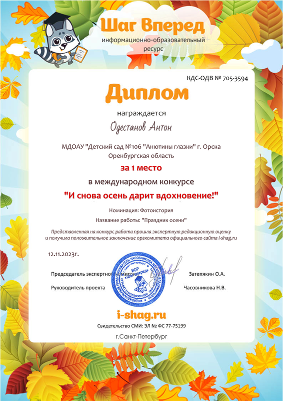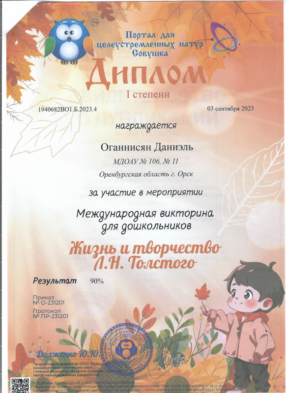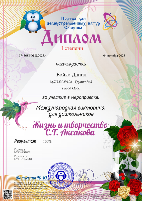 Диплом 1 степени в международной викторине (Бойко Данил)