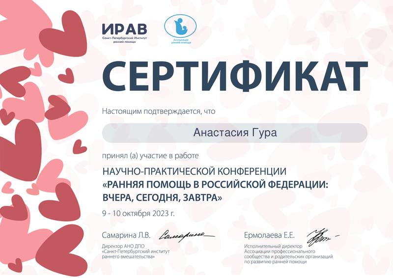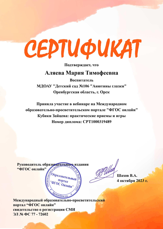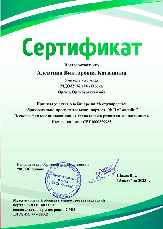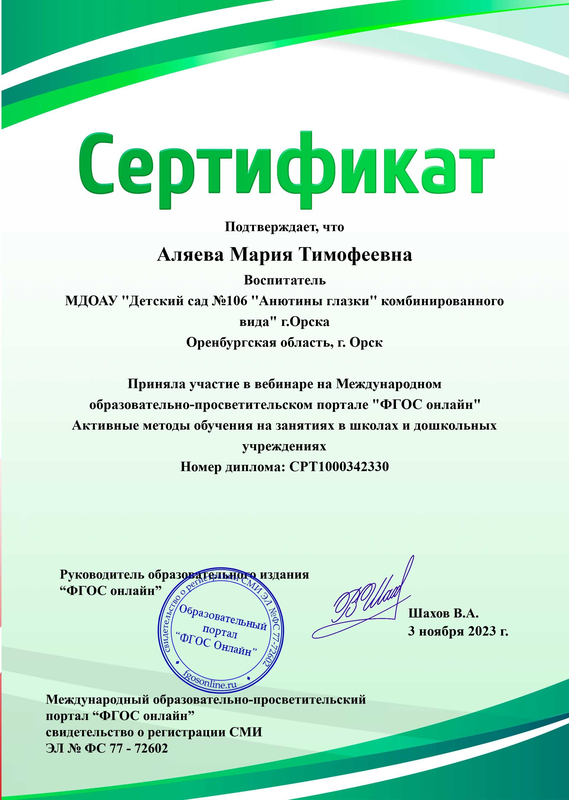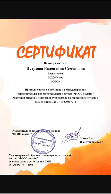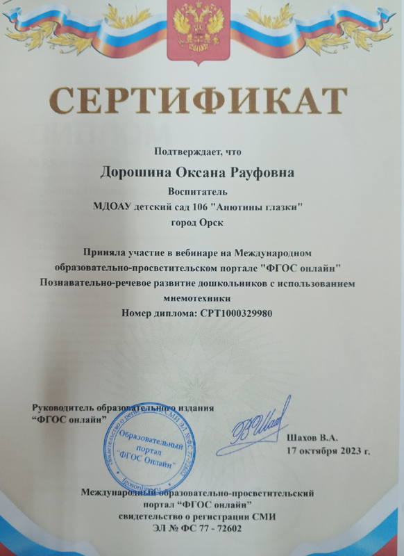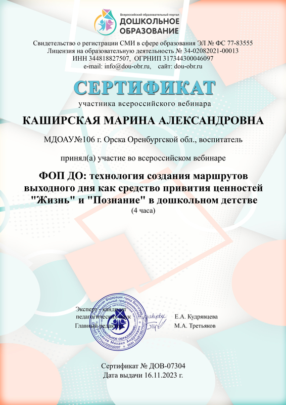 Сертификат участника семинара «Воспитатели России. Новые ориентиры», Всероссийский форум «Воспитатели России», Москва, 20 июля 2023г.