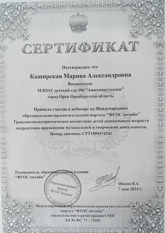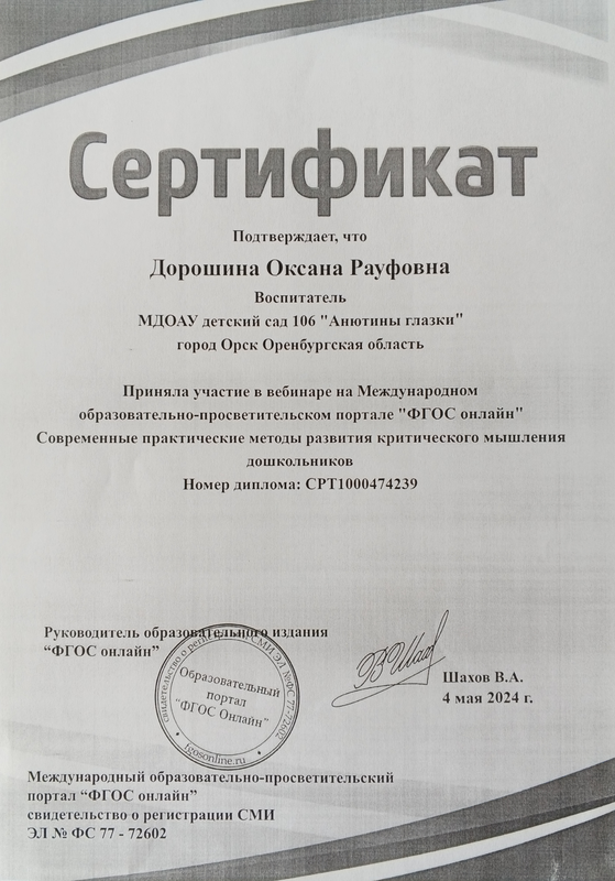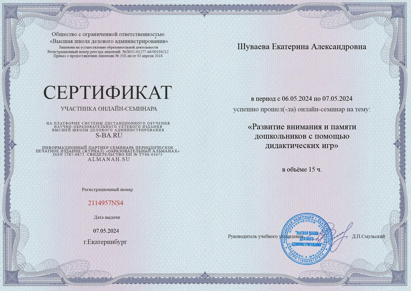 Шуваева Е.А. – сертификат участника онлайн-семинара на тему «Развитие внимания и памяти дошкольников с помощью дидактических игр».