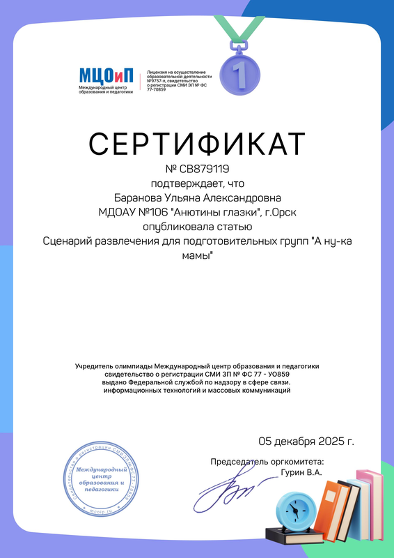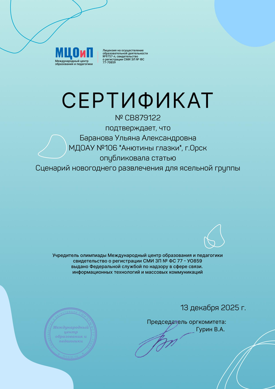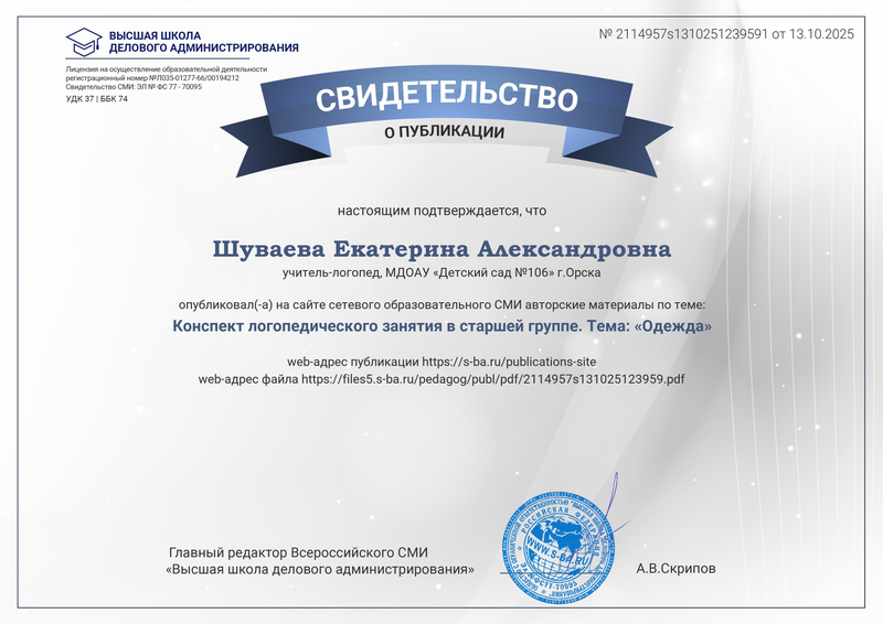Шуваева Е.А. – свидетельство о публикации в СМИ «Конспект логопедического занятия в старшей группе. Тема: "Одежда"