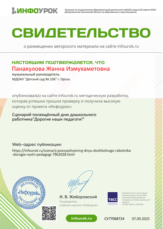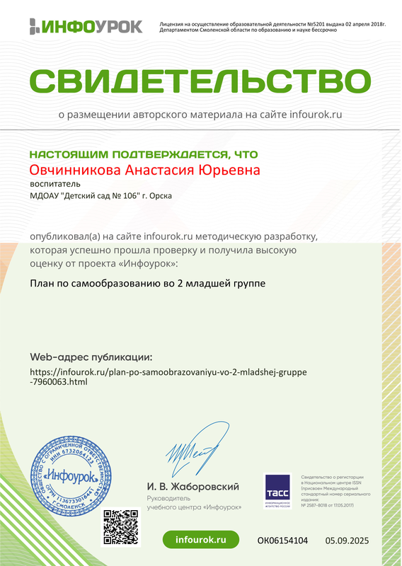 Овчинникова А. Ю. свидетельство о публикации на сайте инфоурок методической разработки