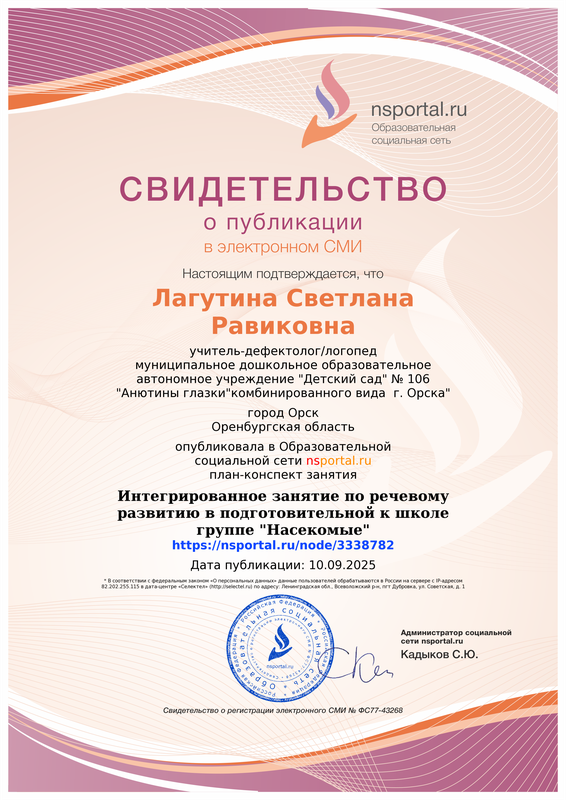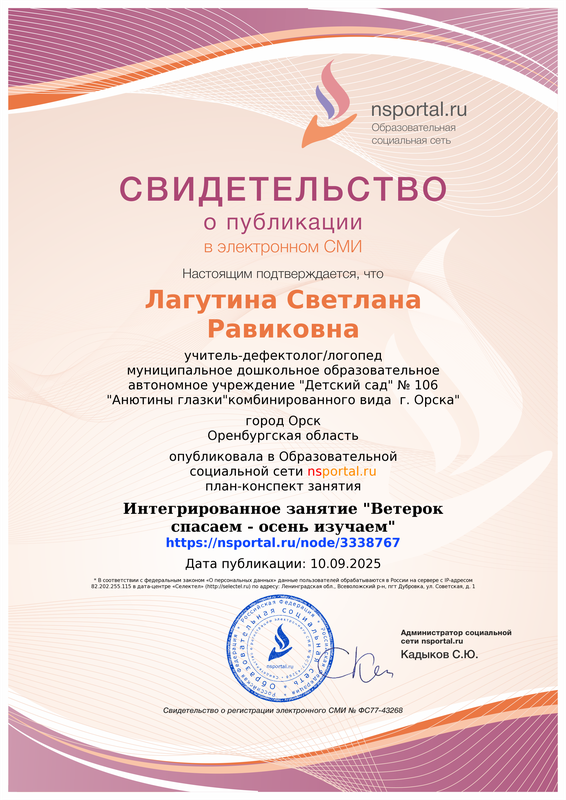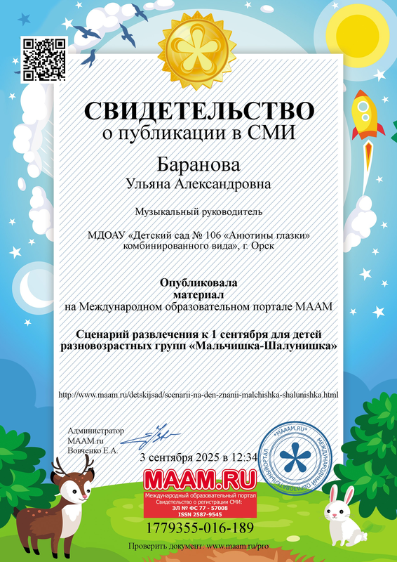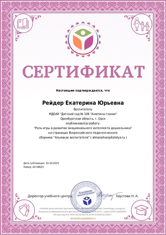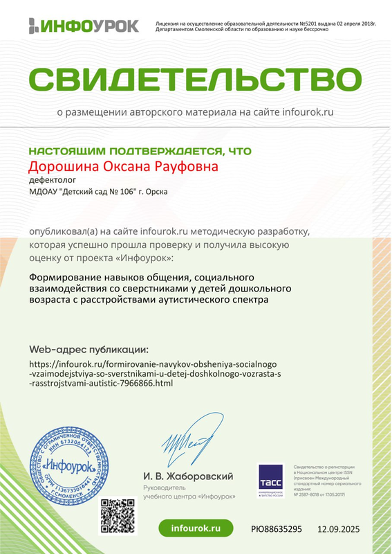 Шуваева Е.А свидетельство о публикации "Формирование предметного словаря старших дошкольников с общим недоразвитием речи посредством дидактических игр" в научно-образовательном журнале «Вестник дошкольного образования» № 70 (400) от 23. 09.2025 г.