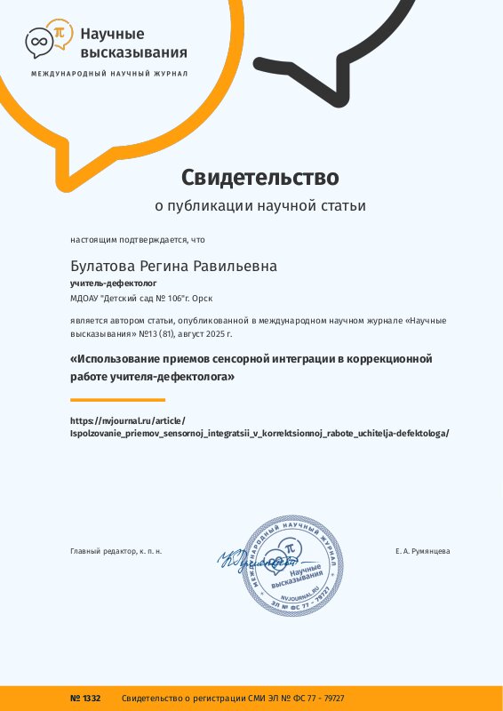 Булатова Р.Р. Публикация статьи в журнале "Научные высказывания": "Использование приемов сенсорной интеграции в коррекционной работе учителя-дефектолога"
