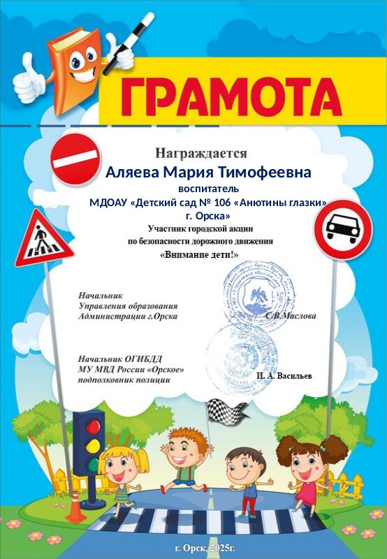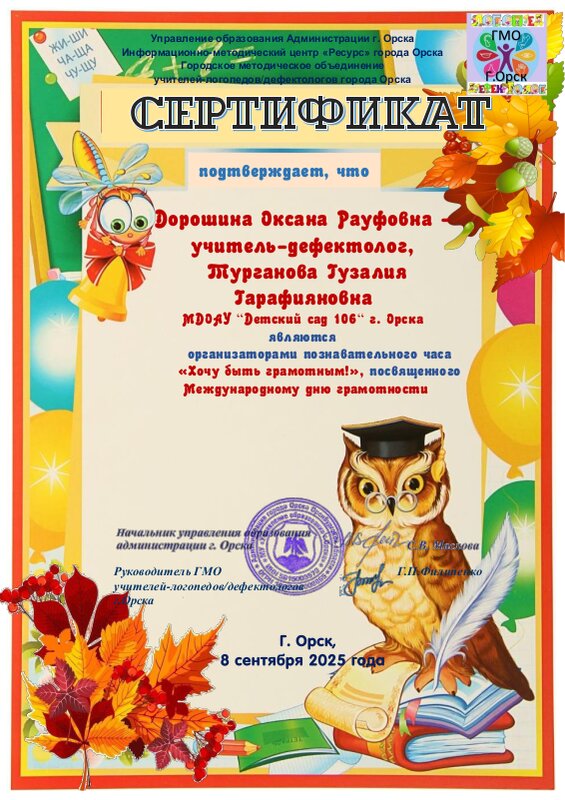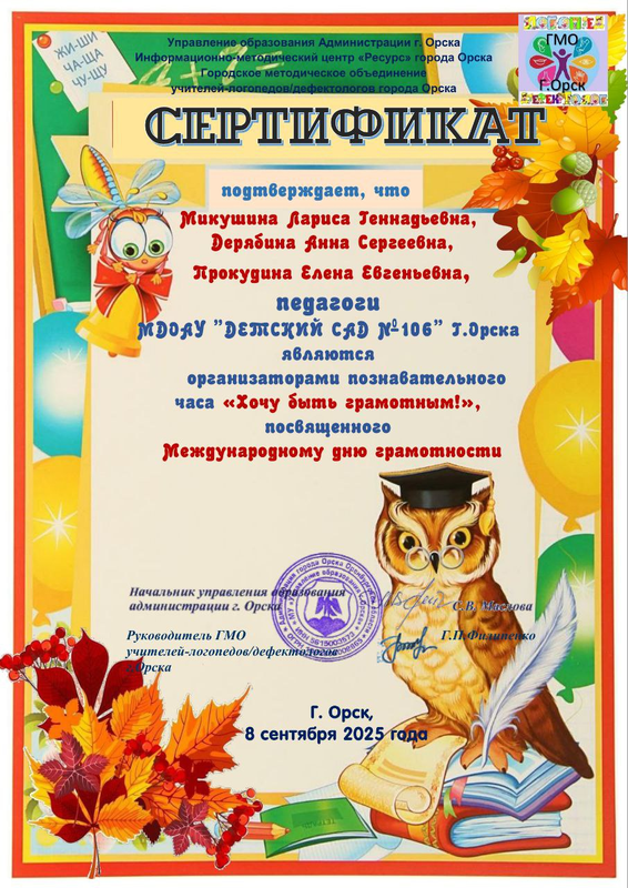 Дерябина А.С. Сертификат за организацию познавательного часа