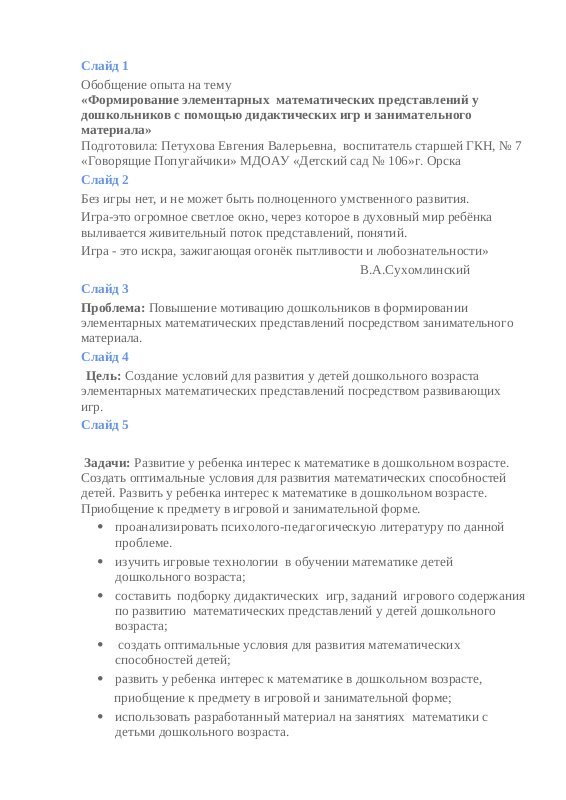 Подготовила: Петухова Евгения Валерьевнаэлементарных математических представлений у дошкольников с помощью дидактических игр и занимательного материала»